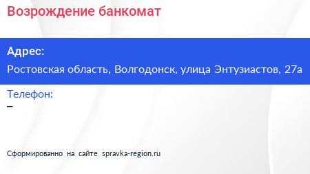 Возрождение, банкомат по адресу Ростовская область, Волгодонск, улица Энтузиастов, 27а в дальнейшем Организация, размещена в следующих категориях: