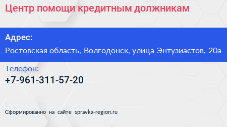 Центр помощи кредитным должникам по адресу Ростовская область, Волгодонск, улица Энтузиастов, 20а в дальнейшем Организация, размещена в следующих категориях: