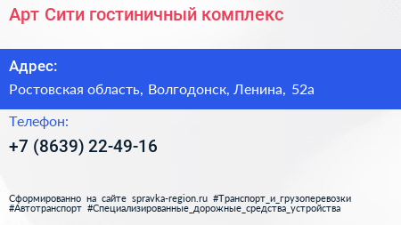 Арт Cити, гостиничный комплекс по адресу Ростовская область, Волгодонск, Ленина, 52а в дальнейшем Организация, размещена в следующих категориях: