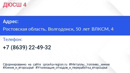 ДЮСШ №4 по адресу Ростовская область, Волгодонск, 50 лет ВЛКСМ, 4 в дальнейшем Организация, размещена в следующих категориях: