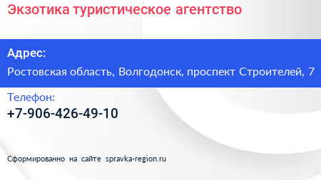 Экзотика, туристическое агентство по адресу Ростовская область, Волгодонск, проспект Строителей, 7 в дальнейшем Организация, размещена в следующих категориях: