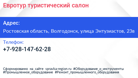 Евротур, туристический салон по адресу Ростовская область, Волгодонск, улица Энтузиастов, 23в в дальнейшем Организация, размещена в следующих категориях: