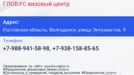 ГЛОБУС, визовый центр по адресу Ростовская область, Волгодонск, улица Энтузиастов, 9 в дальнейшем Организация, размещена в следующих категориях: