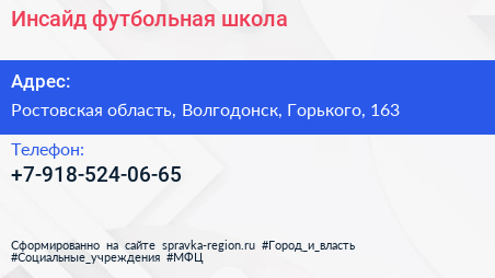 Инсайд, футбольная школа по адресу Ростовская область, Волгодонск, Горького, 163 в дальнейшем Организация, размещена в следующих категориях: