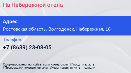 На Набережной, отель по адресу Ростовская область, Волгодонск, Набережная, 18 в дальнейшем Организация, размещена в следующих категориях: