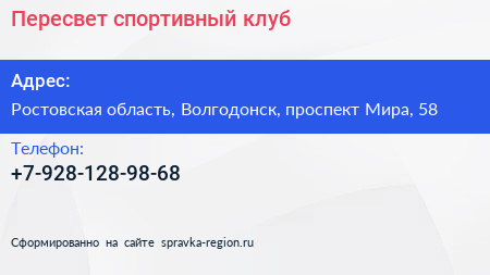 Пересвет, спортивный клуб по адресу Ростовская область, Волгодонск, проспект Мира, 58 в дальнейшем Организация, размещена в следующих категориях: