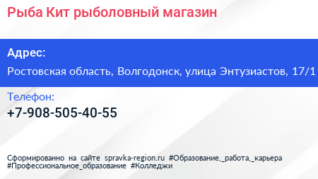 Рыба-Кит, рыболовный магазин по адресу Ростовская область, Волгодонск, улица Энтузиастов, 17/1 в дальнейшем Организация, размещена в следующих категориях: