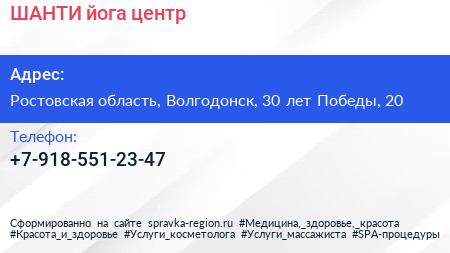 ШАНТИ, йога-центр по адресу Ростовская область, Волгодонск, 30 лет Победы, 20 в дальнейшем Организация, размещена в следующих категориях: