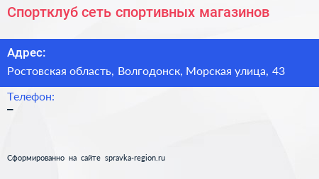 Спортклуб, сеть спортивных магазинов по адресу Ростовская область, Волгодонск, Морская улица, 43 в дальнейшем Организация, размещена в следующих категориях: