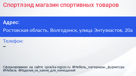 Спортлэнд, магазин спортивных товаров по адресу Ростовская область, Волгодонск, улица Энтузиастов, 20а в дальнейшем Организация, размещена в следующих категориях: