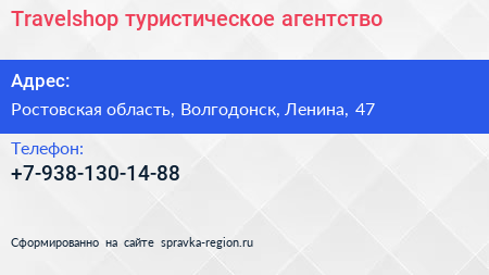 Travelshop, туристическое агентство по адресу Ростовская область, Волгодонск, Ленина, 47 в дальнейшем Организация, размещена в следующих категориях: