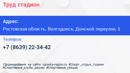 Труд, стадион по адресу Ростовская область, Волгодонск, Донской переулок, 1 в дальнейшем Организация, размещена в следующих категориях: