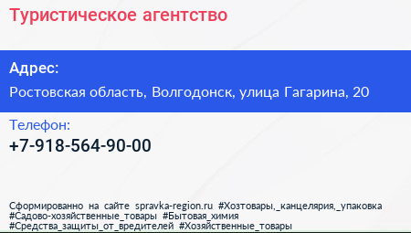 Туристическое агентство по адресу Ростовская область, Волгодонск, улица Гагарина, 20 в дальнейшем Организация, размещена в следующих категориях: