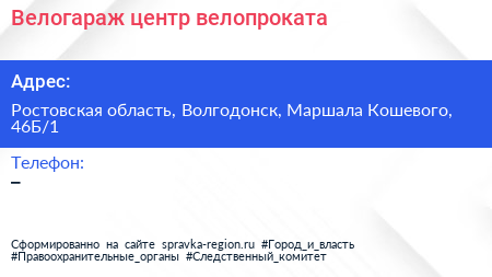 Велогараж, центр велопроката по адресу Ростовская область, Волгодонск, Маршала Кошевого, 46Б/1 в дальнейшем Организация, размещена в следующих категориях: