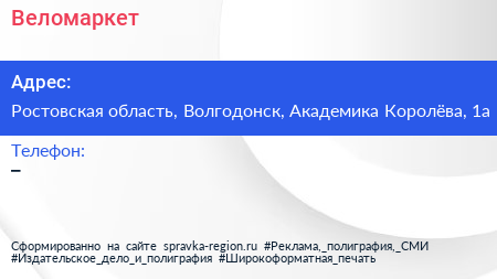 Веломаркет по адресу Ростовская область, Волгодонск, Академика Королёва, 1а в дальнейшем Организация, размещена в следующих категориях: