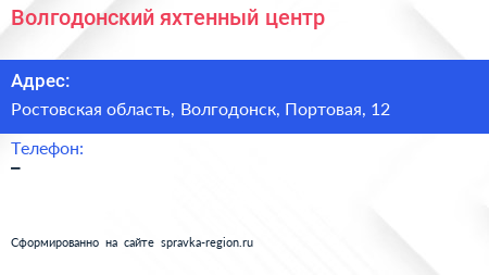 Волгодонский яхтенный центр по адресу Ростовская область, Волгодонск, Портовая, 12 в дальнейшем Организация, размещена в следующих категориях:
