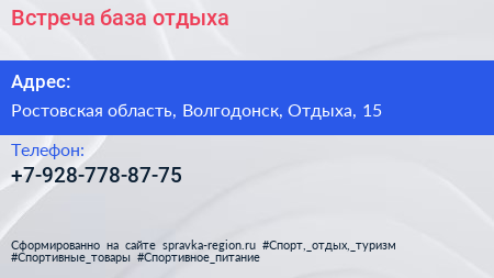 Встреча, база отдыха по адресу Ростовская область, Волгодонск, Отдыха, 15 в дальнейшем Организация, размещена в следующих категориях: