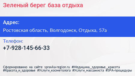 Зеленый берег, база отдыха по адресу Ростовская область, Волгодонск, Отдыха, 57а в дальнейшем Организация, размещена в следующих категориях: