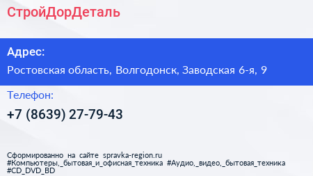 СтройДорДеталь по адресу Ростовская область, Волгодонск, Заводская 6-я, 9 в дальнейшем Организация, размещена в следующих категориях: