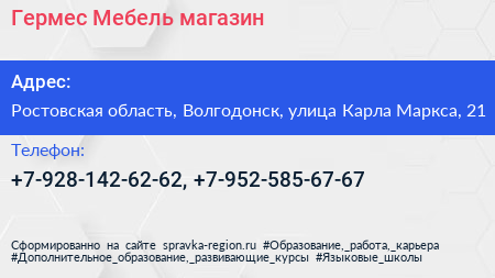 Гермес-Мебель, магазин по адресу Ростовская область, Волгодонск, улица Карла Маркса, 21 в дальнейшем Организация, размещена в следующих категориях: