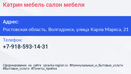 Катрин мебель, салон мебели по адресу Ростовская область, Волгодонск, улица Карла Маркса, 21 в дальнейшем Организация, размещена в следующих категориях: