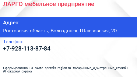 ЛАРГО, мебельное предприятие по адресу Ростовская область, Волгодонск, Шлюзовская, 20 в дальнейшем Организация, размещена в следующих категориях: