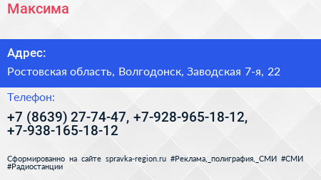 Максима по адресу Ростовская область, Волгодонск, Заводская 7-я, 22 в дальнейшем Организация, размещена в следующих категориях: