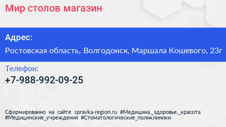 Мир столов, магазин по адресу Ростовская область, Волгодонск, Маршала Кошевого, 23г в дальнейшем Организация, размещена в следующих категориях: