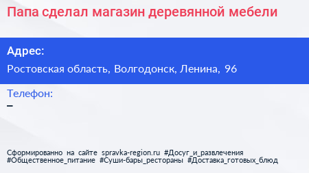Папа сделал, магазин деревянной мебели по адресу Ростовская область, Волгодонск, Ленина, 96 в дальнейшем Организация, размещена в следующих категориях: