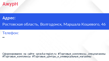 АжурН по адресу Ростовская область, Волгодонск, Маршала Кошевого, 46 в дальнейшем Организация, размещена в следующих категориях: