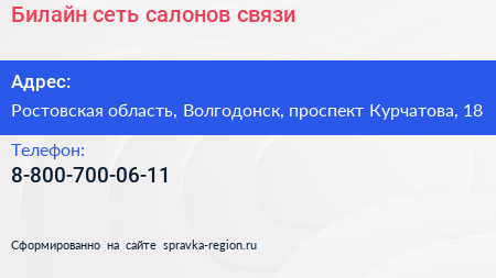 Билайн, сеть салонов связи по адресу Ростовская область, Волгодонск, проспект Курчатова, 18 в дальнейшем Организация, размещена в следующих категориях: