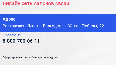 Билайн, сеть салонов связи по адресу Ростовская область, Волгодонск, 30 лет Победы, 22 в дальнейшем Организация, размещена в следующих категориях: