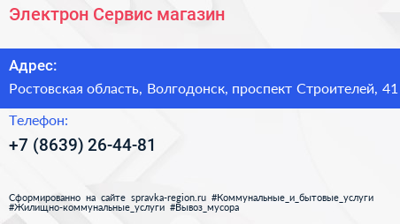 Электрон Сервис, магазин по адресу Ростовская область, Волгодонск, проспект Строителей, 41 в дальнейшем Организация, размещена в следующих категориях: