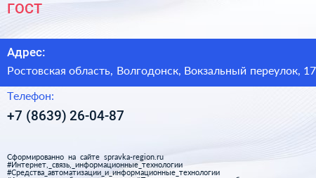 ГОСТ по адресу Ростовская область, Волгодонск, Вокзальный переулок, 17 в дальнейшем Организация, размещена в следующих категориях: