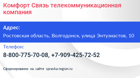 Комфорт-Связь, телекоммуникационная компания по адресу Ростовская область, Волгодонск, улица Энтузиастов, 10 в дальнейшем Организация, размещена в следующих категориях:
