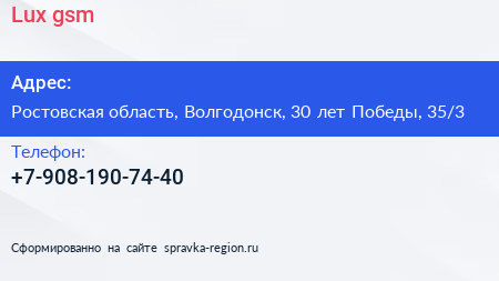 Lux gsm по адресу Ростовская область, Волгодонск, 30 лет Победы, 35/3 в дальнейшем Организация, размещена в следующих категориях: