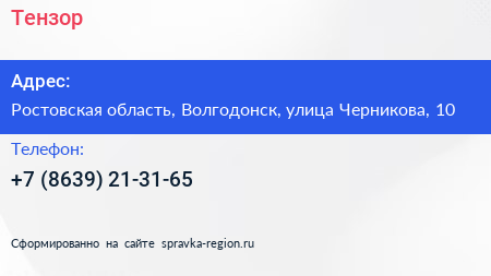 Тензор по адресу Ростовская область, Волгодонск, улица Черникова, 10 в дальнейшем Организация, размещена в следующих категориях: