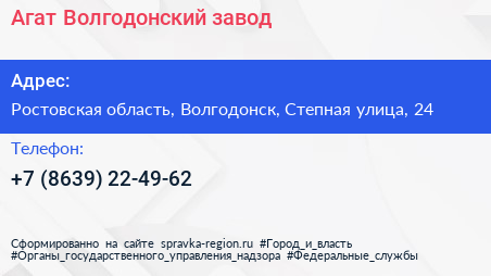 Агат, Волгодонский завод по адресу Ростовская область, Волгодонск, Степная улица, 24 в дальнейшем Организация, размещена в следующих категориях: