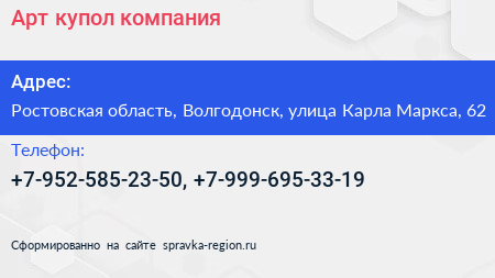 Арт купол, компания по адресу Ростовская область, Волгодонск, улица Карла Маркса, 62 в дальнейшем Организация, размещена в следующих категориях: