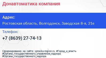 Донавтоматика, компания по адресу Ростовская область, Волгодонск, Заводская 8-я, 21е в дальнейшем Организация, размещена в следующих категориях: