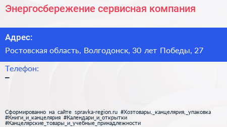 Энергосбережение, сервисная компания по адресу Ростовская область, Волгодонск, 30 лет Победы, 27 в дальнейшем Организация, размещена в следующих категориях: