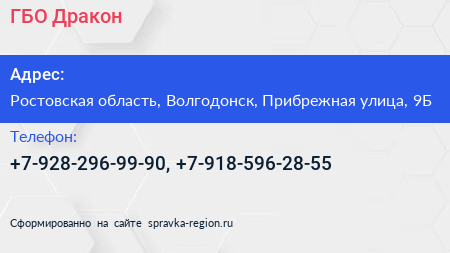 ГБО Дракон по адресу Ростовская область, Волгодонск, Прибрежная улица, 9Б в дальнейшем Организация, размещена в следующих категориях: