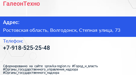 ГалеонТехно по адресу Ростовская область, Волгодонск, Степная улица, 73 в дальнейшем Организация, размещена в следующих категориях: