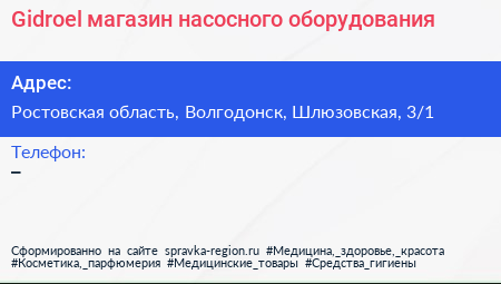 Gidroel, магазин насосного оборудования по адресу Ростовская область, Волгодонск, Шлюзовская, 3/1 в дальнейшем Организация, размещена в следующих категориях: