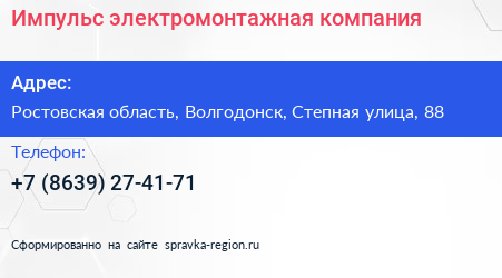Импульс, электромонтажная компания по адресу Ростовская область, Волгодонск, Степная улица, 88 в дальнейшем Организация, размещена в следующих категориях: