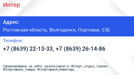 Интер по адресу Ростовская область, Волгодонск, Портовая, 13Б в дальнейшем Организация, размещена в следующих категориях: