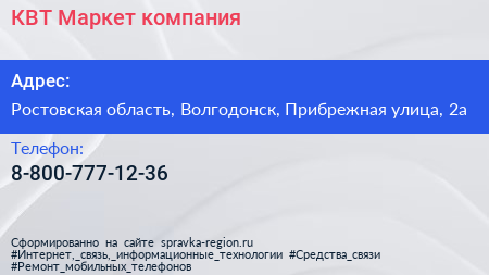 КВТ Маркет, компания по адресу Ростовская область, Волгодонск, Прибрежная улица, 2а в дальнейшем Организация, размещена в следующих категориях: