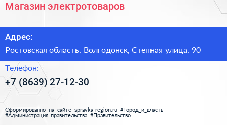 Магазин электротоваров по адресу Ростовская область, Волгодонск, Степная улица, 90 в дальнейшем Организация, размещена в следующих категориях: