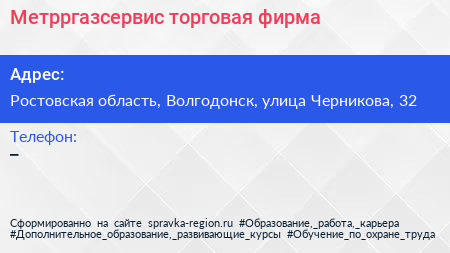 Метрргазсервис, торговая фирма по адресу Ростовская область, Волгодонск, улица Черникова, 32 в дальнейшем Организация, размещена в следующих категориях: