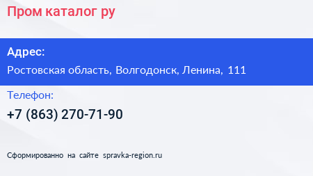 Пром-каталог.ру по адресу Ростовская область, Волгодонск, Ленина, 111 в дальнейшем Организация, размещена в следующих категориях: